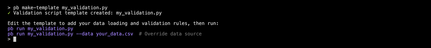 The pb validate command lets you perform common validation checks directly on your data source with a simple command-line interface. This works well both for quick, one-off checks and for use in automated pipelines.
